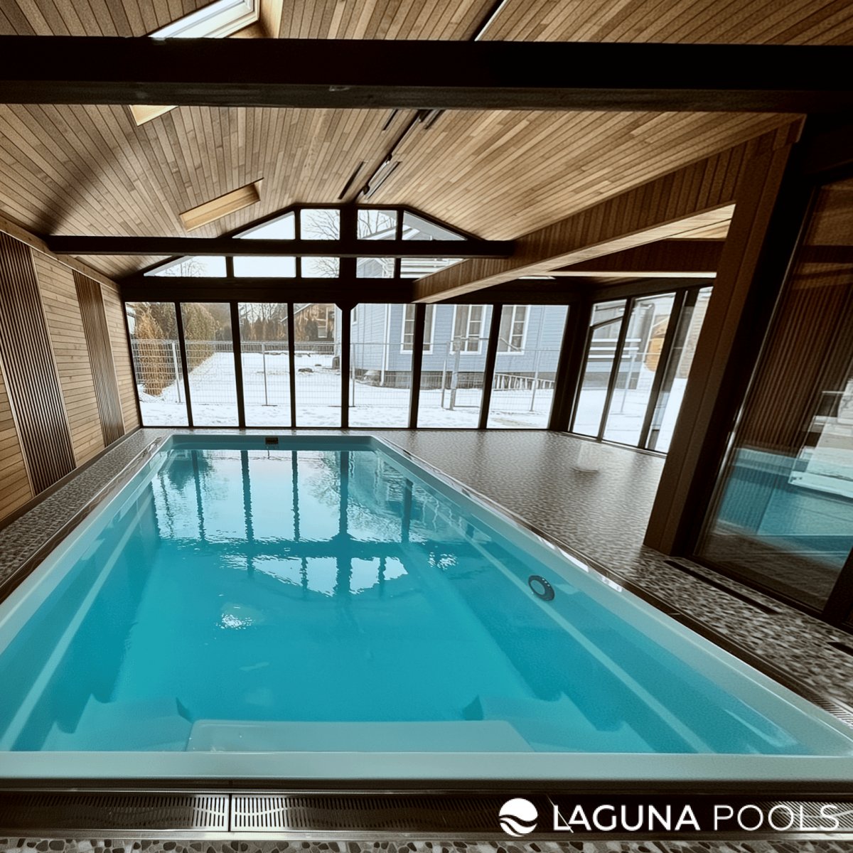 Композитный бассейн в интерьере с деревянной отделкой и видом на зимний пейзаж.