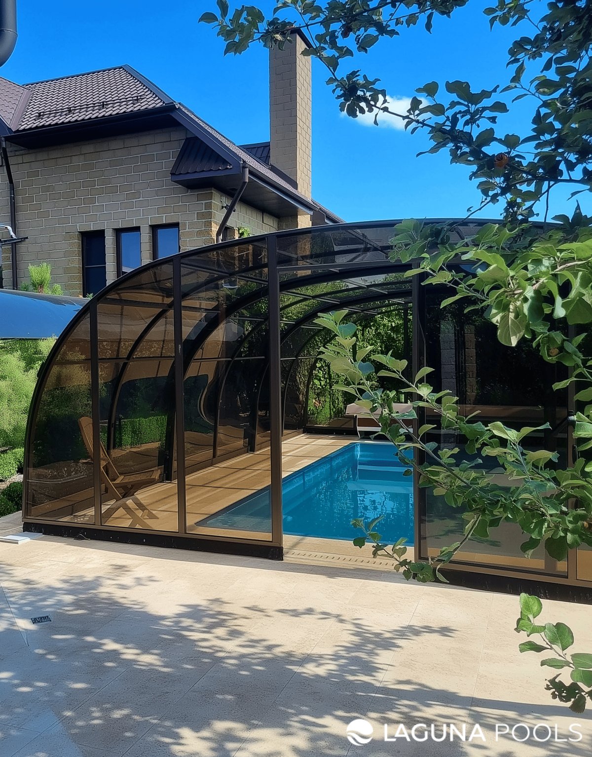 Композитный бассейн с раздвижным тёмно-коричневым павильоном и деревянным настилом на придомовой территории